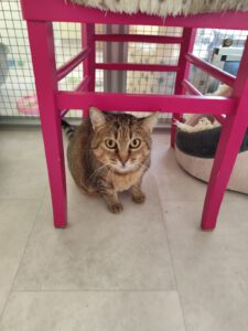 Die etwa vierjährige Cakepop kam zu uns, weil ihre Besitzerin sich krankheitsbedingt nicht mehr um sie kümmern konnte. Für sie ist das Katzenhaus aktuell eine große Belastung, statt neugierig alles zu erkunden, zieht sie sich lieber in ihre Höhle zurück und beobachtet aus sicherer Entfernung.