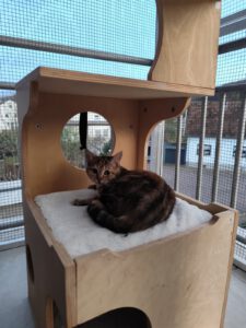 Im Katzenhaus liegt Cumina besonders gerne auf dem Balkon, wo sie alles in Ruhe überblicken kann. Später sollte sie, sobald sie angekommen ist und sich sicher fühlt, Freigang bekommen dürfen. Das entspricht ihrem Wesen.